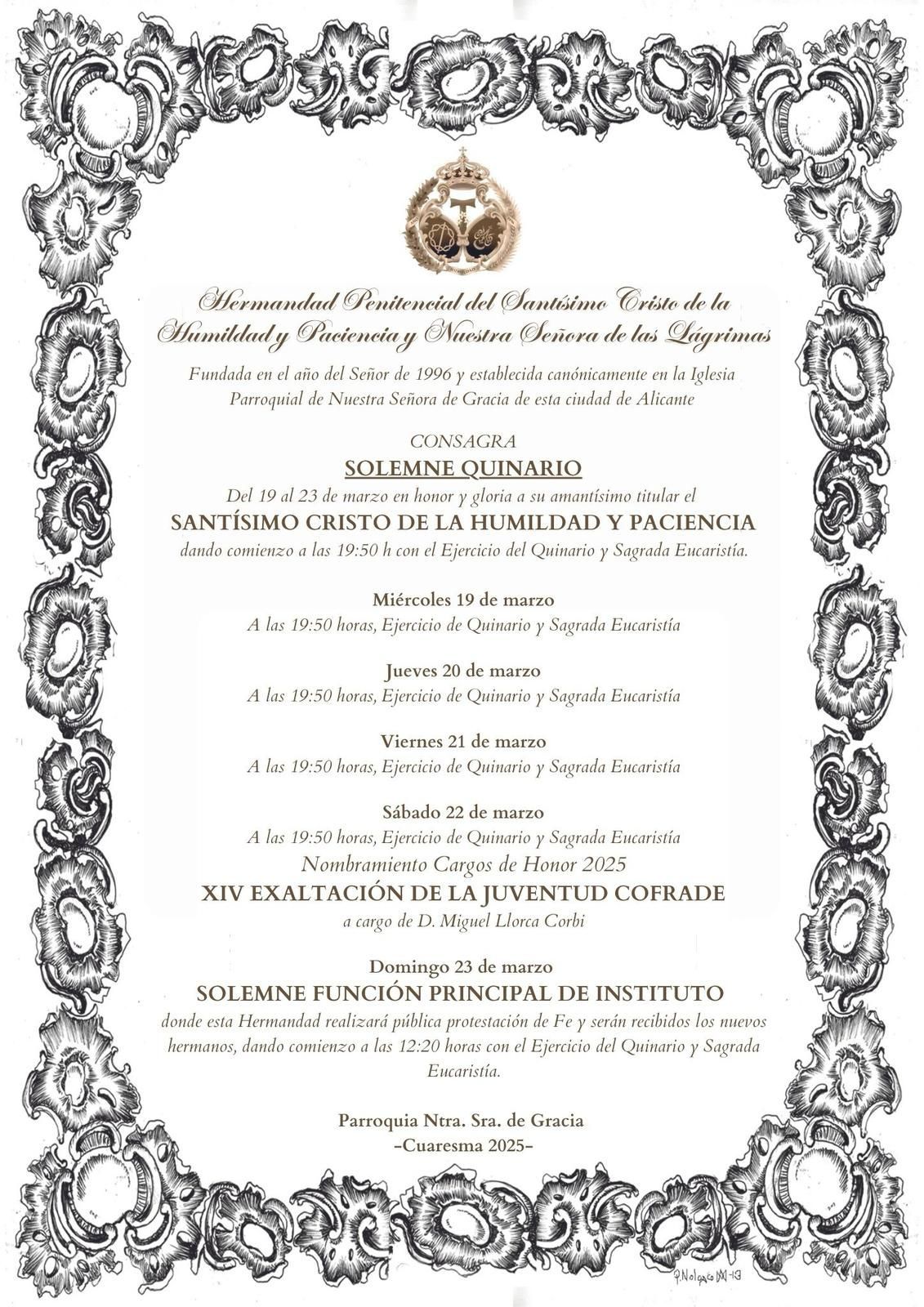 La próxima semana celebraremos el Solemne Ejercicio de Quinario en honor a nuestro sagrado titular, el Santísimo Cristo de la Humildad y Paciencia. Dará comienzo el miércoles 19 de marzo y concluirá el domingo 23 con nuestro Acto Institucional. Recordaros también que el sábado 22 de marzo tendrá lugar el acto del XIV Exaltación de la Juventud Cofrade, realizado por nuestro querido amigo Miguel Llorca Corbí. ¡Os esperamos!