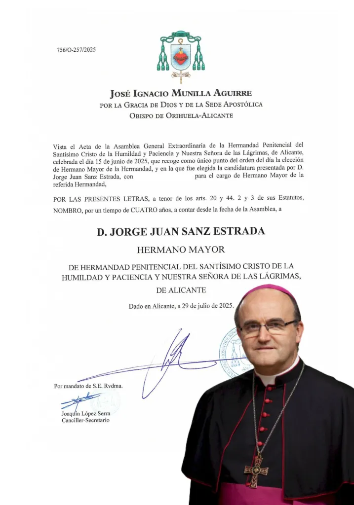 La Hermandad del Santísimo Cristo de la Humildad y Paciencia y Nuestra Señora de las Lágrimas comunica oficialmente el nombramiento de Jorge Juan Sanz Estrada