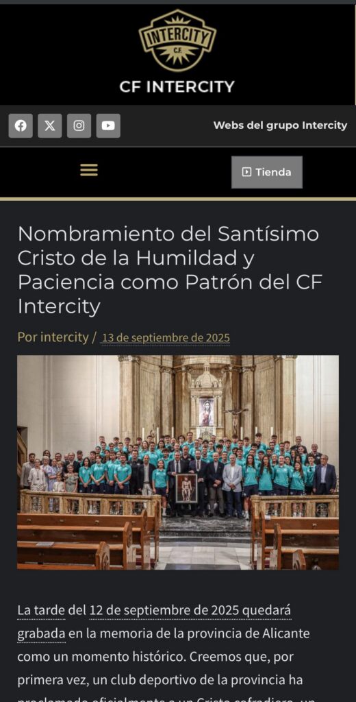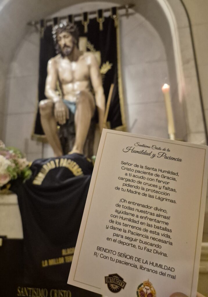 La Parroquia de Nuestra Señora de Gracia acogió el acto mediante el cual el Santísimo Cristo de la Humildad y Paciencia fue proclamado Patrón del CF Intercity, en una ceremonia que unió simbólicamente fe, deporte y comunidad. El evento reunió a representantes institucionales del club, miembros de la Hermandad y numerosos jugadores, en un ambiente de recogimiento y significado espiritual.