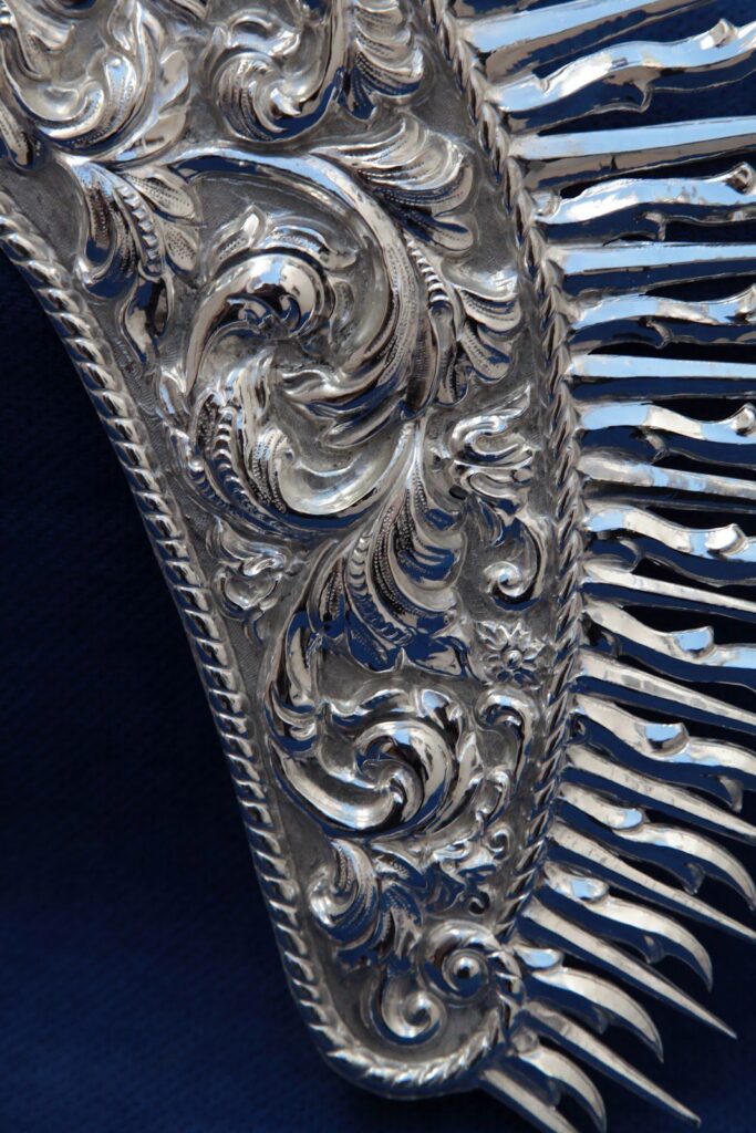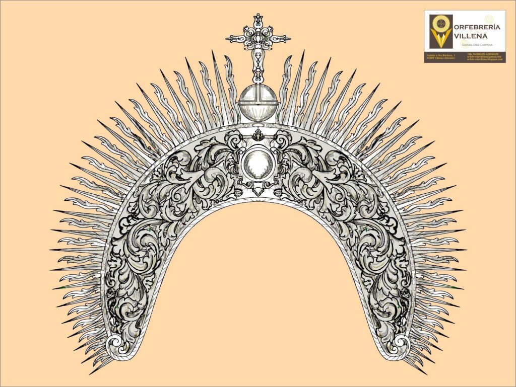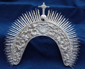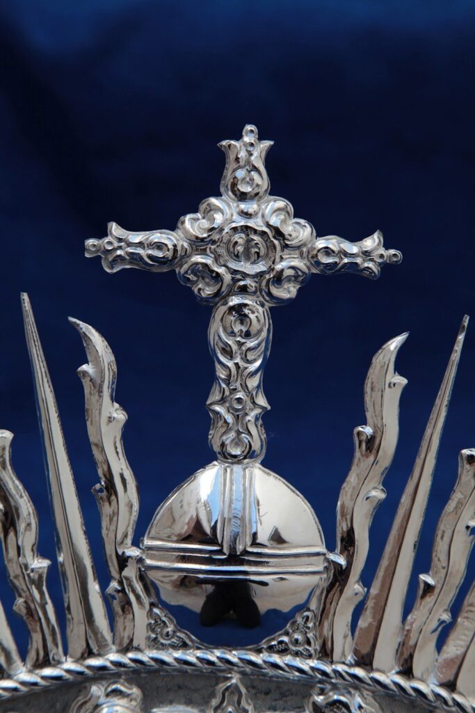 La diadema de Ntra. Sra. de las Lágrimas de estilo barroco plateada inspirada en los patrones que se hacían en el siglo XVIII, es un modelo exclusivo cincelado a mano por el orfebre Samuel Díaz Carpena realizado en los talleres de Orfebrería Villena.