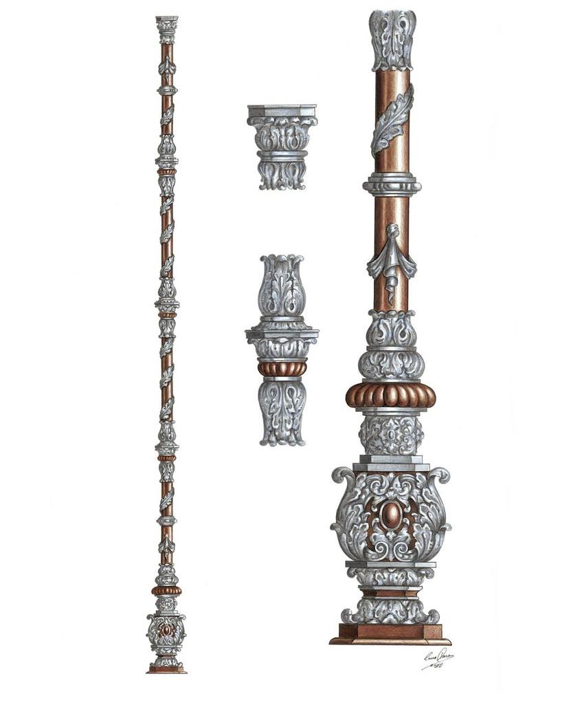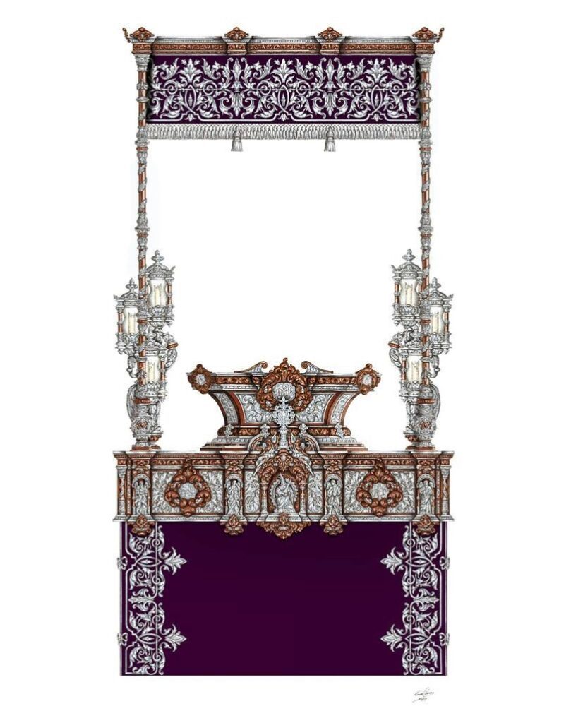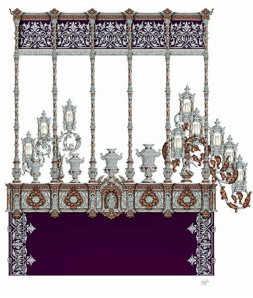 El palio presenta un diseño clásico, de cajón donde la presencia de la madera es poderosa y una fina orfebrería que culmina con unos bordados en plata.