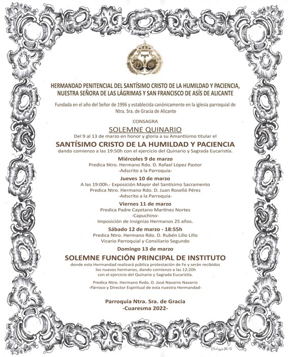 La Hermandad Penitencial del Santísimo Cristo de la Humildad y Paciencia, Nuestra Señora de las Lágrimas y San Francisco de Asís consagra a su venerado Titular el Santísimo Cristo de la Humildad y Paciencia, en el Solemne Quinario del día 9 al 13 de marzo de 2022, comenzando cada día con el ejercicio del Quinario y Santa Misa, predicadas por Ntro. Hno. Rvdo. D. Rafael López Pastor, Ntro. Hno. Rvdo. D. Juan Roselló Pérez, el Padre Cayetano Martínez Nortes, Ntro. Hno. Rvdo. D. Rubén Lillo Lillo y Ntro. Hno. Rvdo. D. José Navarro Navarro., en la Parroquia de Nuestra Señora de Gracia.
